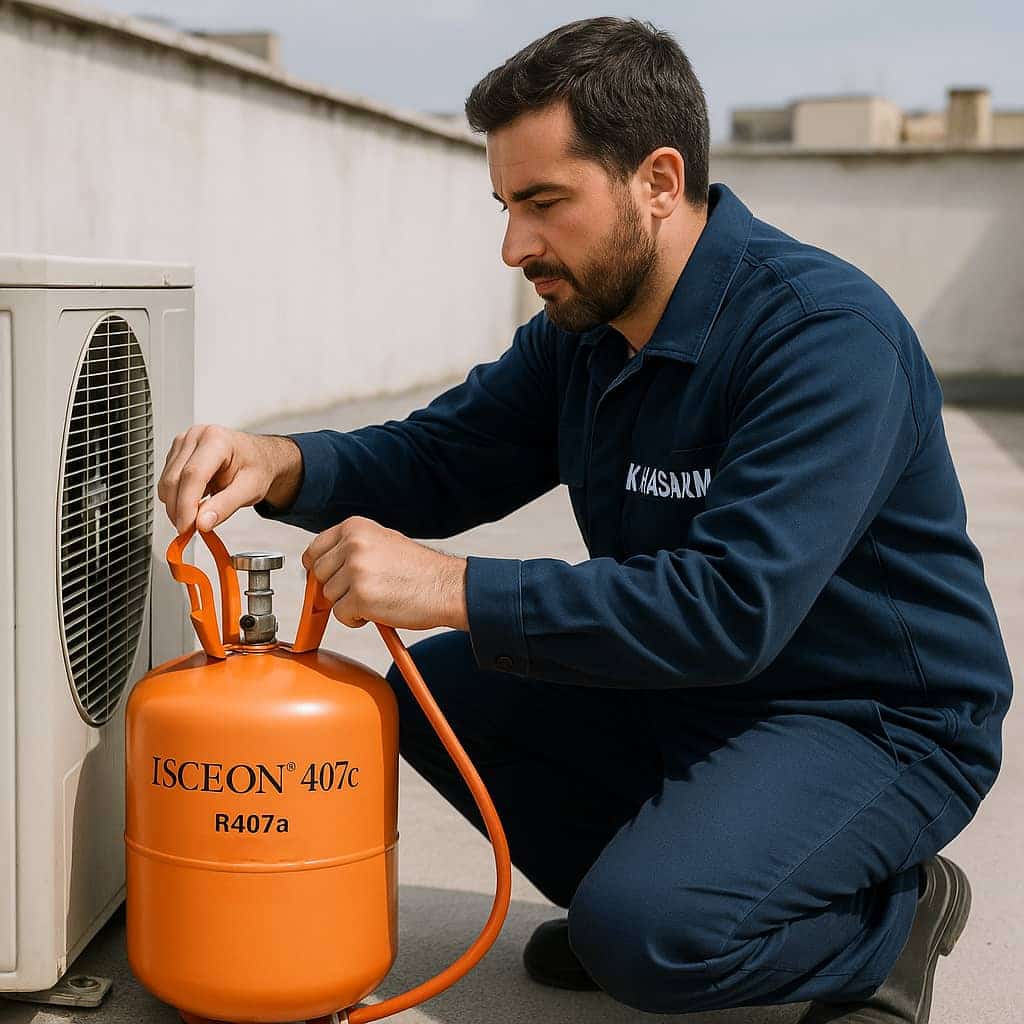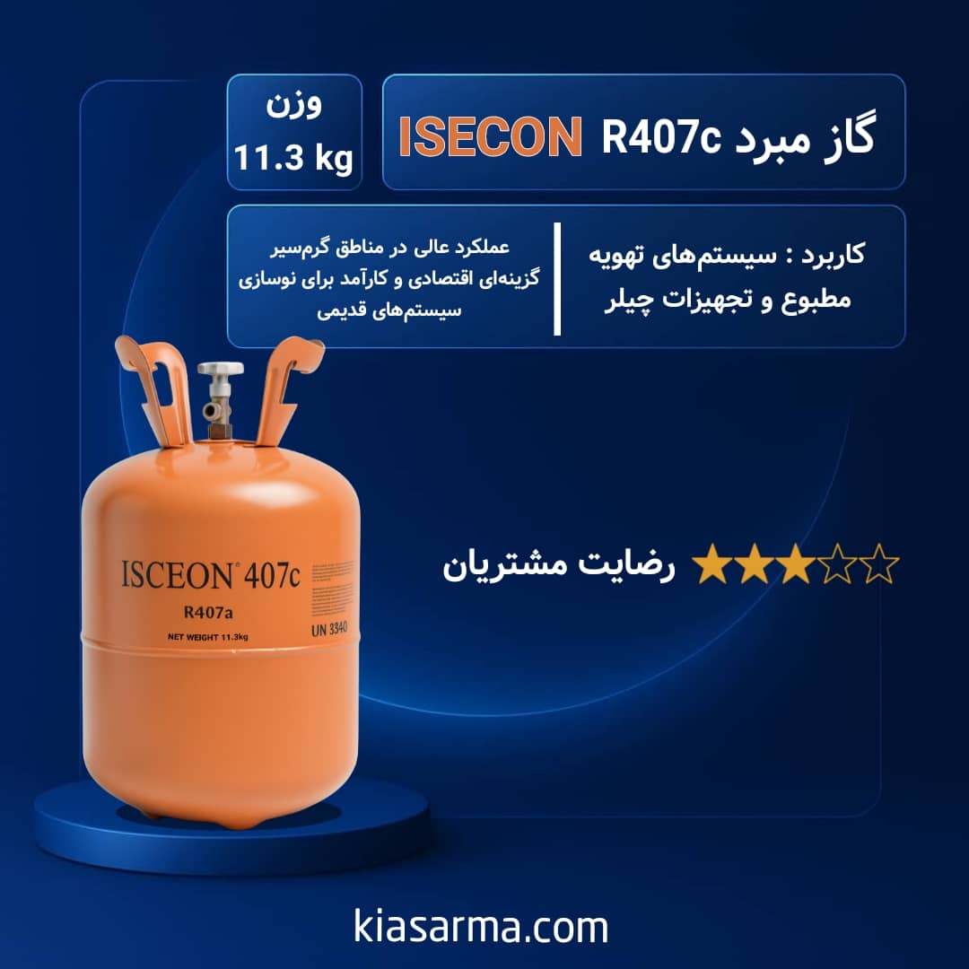 گاز R-407C یک مبرد ترکیبی (HFC) است که به عنوان جایگزین گاز R-22 در سیستم های تهویه مطبوع و پمپ های حرارتی استفاده میشود. این گاز برخلاف R-22، آسیبی به لایه اوزون نمیرساند، اما همچنان پتانسیل گرمایش جهانی (GWP) نسبتاً بالایی دارد. R-407C به دلیل تطابق خوب با برخی سیستمهای قدیمی R-22 (با تغییرات جزئی) و عملکرد مناسب در دماهای متعادل، در کولرهای گازی، چیلرها و برخی سیستمهای تجاری کاربرد دارد.