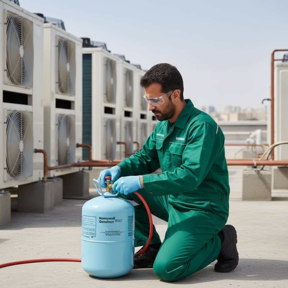 گاز R507 (مبرد فریون 507) به دلیل کارایی بالا در دماهای پایین و فشار کاری زیاد، عمدتاً در سیستمهای تجاری و صنعتی مانند یخچالهای فروشگاهی، سردخانههای بزرگ، سیستمهای انجماد سریع (بلاست فریزر) و چیلرهای صنعتی استفاده میشود. این مبرد بهعنوان جایگزین R502 و R22 طراحی شده و به دلیل عدم اشتعالپذیری و پایداری حرارتی بالا، گزینهای مطمئن برای تجهیزات سرمایشیِ سنگین محسوب میشود. البته به دلیل GWP بالا (پتانسیل گرمایش جهانی)، کاربرد آن در برخی کشورها تحت مقررات زیستمحیطی محدود شده است.