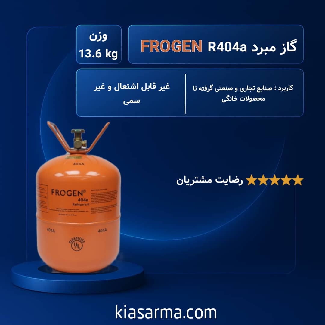 گاز R404a فروژن (FROGEN) یک گاز بی رنگ، غیر سمی و غیر قابل اشتعال می باشد و مورد استفاده در اکثر سیستم های تهویه مطبوع و تبرید خانگی و صنعتی در دمای متوسط و پایین قرار می گیرد. از دیگر مزایای گاز مبرد R404a می توان به سازگاری با انواع کمپرسور های سیستم تبرید و تهویه مطبوع از جمله کمپرسور سکاپ، کمپرسور دو مرحله ای بیتزر، کمپرسور اسکرال بیتزر، کمپرسور منیروپ دانفوس، کمپرسور سمی هرمتیک کوپلند و همچنین سازگاری با انواع اکسپنشن ولو دانفوس و آلکو اشاره کرد.